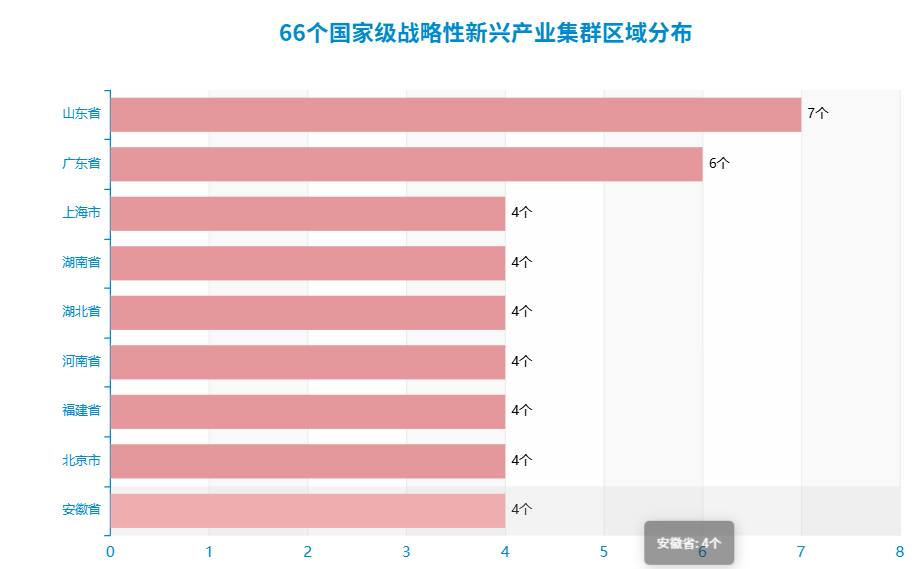 从区域分布看,这些集群主要集中在华东地区(27个),其次是华北地区(12个)、华南地区(11个)、华中地区(5个)等,呈现出“东强西弱”的格局。其中,山东、广东、江苏、安徽等省数量领先,分别拥有7、6、5、4个集群,显示出这些地区在新兴产业布局上的先发优势。